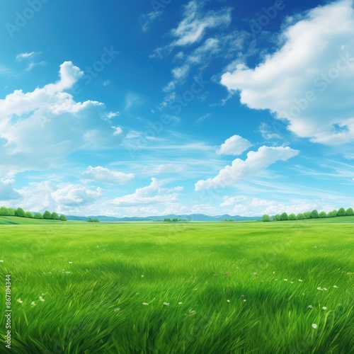 © Boomanoid, Obraz premium Lush green field with flowers and clouds in the sky