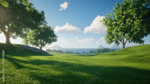 © trustmastertx, Obraz premium Lush green field with large trees, hills, and a distant ocean under a sunny sky.