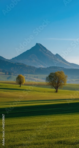 Fototapeta premium Lush green field with two trees, mountain backdrop, clear blue sky. Serene...