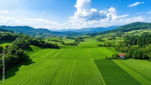 © Ashalina, Fototapeta premium Lush green fields and distant hills aerial landscape agriculture farming