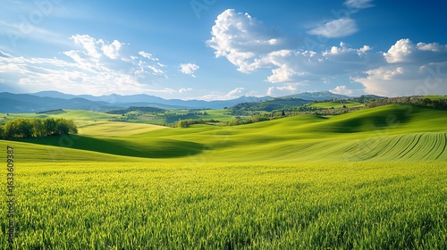 © Ketiga, Fototapeta premium Lush green fields roll into a valley under a bright sky