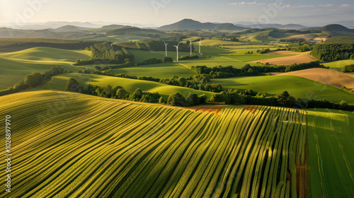 Fototapeta premium Lush green fields stretch across landscape, with electric wind turbines dotting horizon, creating serene and sustainable environment