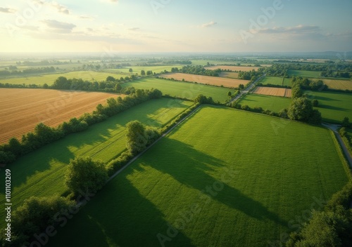 Obraz premium Lush green fields stretch across the countryside under a golden sunset sky