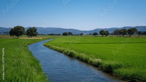 Obraz premium Lush Green Fields with an Irrigation Canal Flowing Through Agricultural...