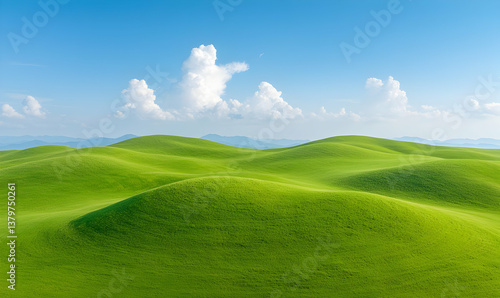 © Maliwan, Fototapeta premium Lush Green Fields with Rolling Hills Under Bright Blue Sky
