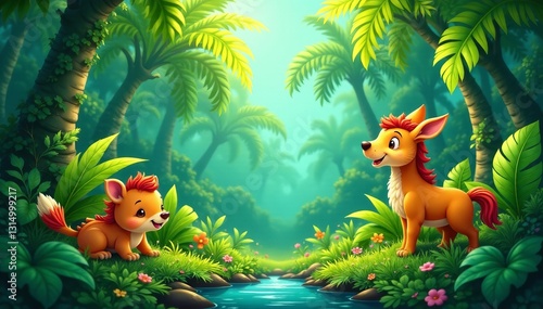 Fototapeta premium Lush green foliage and playful animals in a vibrant tropical setting, colorful, foliage