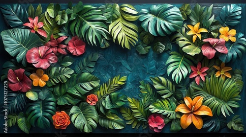 Naklejka premium lush green foliage enveloping a tropical jungle scene, filled with rich textures and vibrant colors, capturing the essence of untouched nature and biodiversity