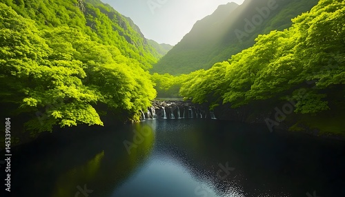 Fototapeta premium Lush green foliage flanks a tranquil pool fed by a cascading waterfall nestled within a verdant mountain valley Sunligh