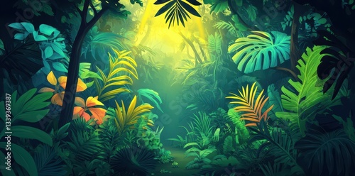 © NArts, Obraz premium Lush green foliage in a brightly illuminated tropical rainforest scene