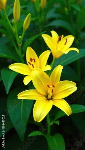 Fototapeta premium Lush green foliage with bright yellow lily blooms, la hybrida, blooming