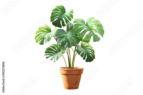 © Mufid, Fototapeta premium Lush green foliage with natural split leaves in a terracotta pot
