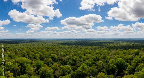 Fototapeta premium Lush green forest canopy under blue sky with fluffy clouds
