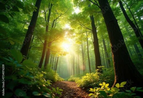 © Yaroslava, Obraz premium Lush Green Forest Canopy Vibrant Nature Scene View from Below Sunlight Filter Through Leaves