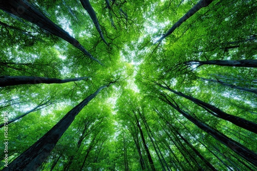 © twilight mist, Naklejka premium Lush green forest canopy viewed from below.