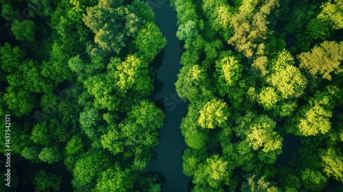 © gentho, Naklejka premium Lush green forest canopy with a ribbon of water running through it