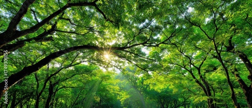 Naklejka premium Lush green forest canopy with sunlight filte through dense leaves and vibrant foliage creating a peaceful natural scene