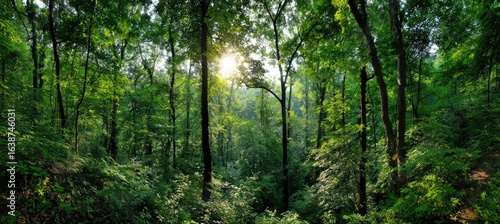 Obraz premium Lush green forest canopy with sunlight filtering through