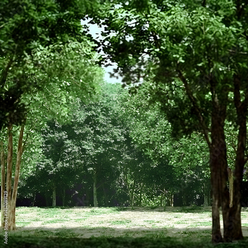 Obraz premium Lush green forest clearing, sunlit meadow, tranquil nature scene, ideal for...