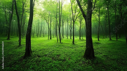 © mahir, Fototapeta premium Lush green forest floor bathed in soft, diffused light.