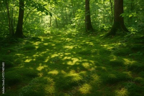 © LucieAliceNova, Obraz premium Lush Green Forest Floor Covered in Soft Moss and Dappled Sunlight