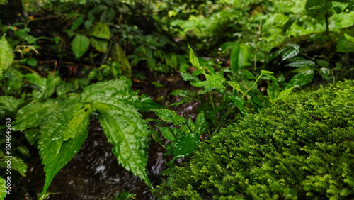 © dwi prasetyo, Fototapeta premium Lush Green Forest Floor with Moss and Stream