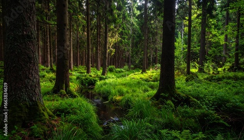 © Likin, Fototapeta premium Lush Green Forest Floor with Sunlight Filtering Through Tall Trees.