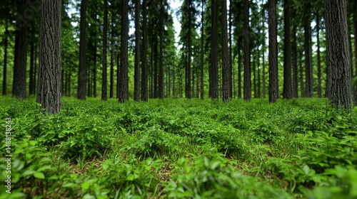 © sarinrat, Fototapeta premium Lush Green Forest Floor with Tall Pine Trees