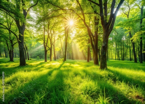 © chokdeelaw, Fototapeta premium Lush green forest grass swaying gently under the warm sun's rays