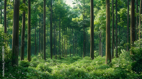© Muhyidin, Obraz premium Lush Green Forest Interior With Tall Trees Sunlight Illuminating Path Through Dense Foliage