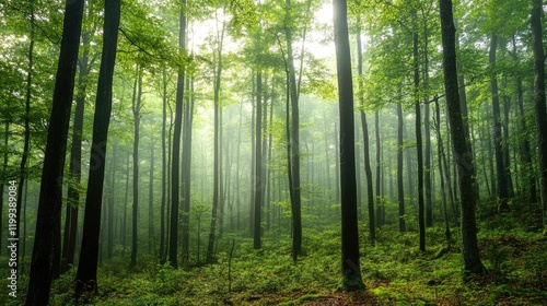 © Cyber Shutter, Obraz premium Lush green forest landscape enveloped in mist and fog with tall trees creating serene atmosphere and ample empty space for text insertions