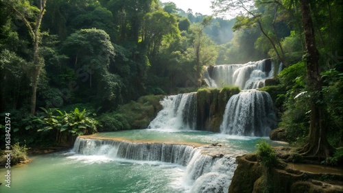 Fototapeta premium Lush green forest landscape with cascading waterfalls and turquoise water...