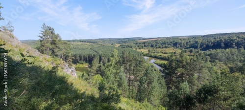 © Irinka Dimkovna, Fototapeta premium Lush Green Forest Landscape with Rolling Hills and a Winding River on a Sunny Day. Scenic Beauty