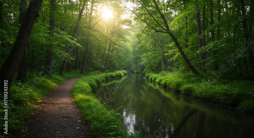 © Nurul, Obraz premium Lush Green Forest Path Beside Dark Water with Sunlight