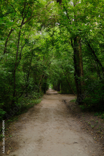 © Ployker, Fototapeta premium Lush green forest path in spring or summer. Nature trail through dense woods, outdoor adventure, and hiking concept.