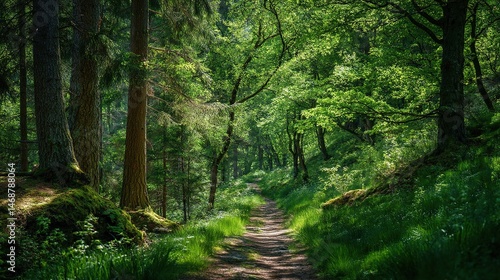 Naklejka premium Lush Green Forest Path Leading Into Bright Sunlit Distance