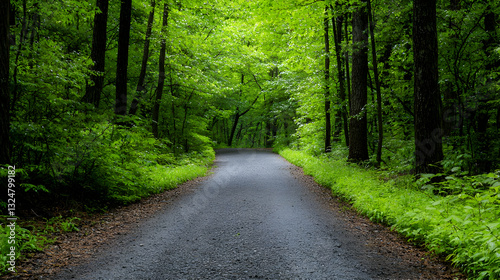 © julio, Obraz premium Lush Green Forest Path Leading Into Light With Tall Trees Surrounding Roadway And Sunlit Canopy