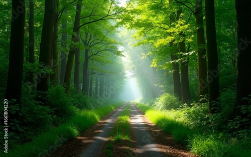 Obraz premium Lush green forest path, misty tunnel of trees, nature background,...