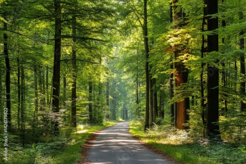 Obraz premium Lush green forest path reveals solitude and tranquility during a sunny day in...
