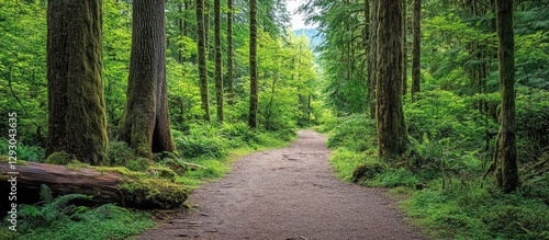 © Gular, Fototapeta premium Lush green forest path winding through tall trees with sunlight filtering through foliage creating a serene and enchanting natural atmosphere