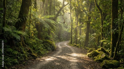 © sus, Obraz premium Lush Green Forest Path with Sunbeams and Gravel Road
