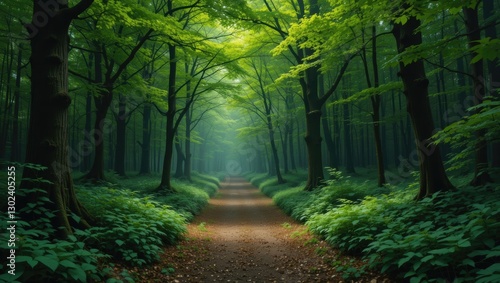 Fototapeta premium Lush Green Forest Pathway Bathed in Sunlight Through Trees in a Peaceful...