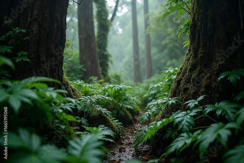 Fototapeta premium Lush green forest pathway surrounded by tall trees and ferns