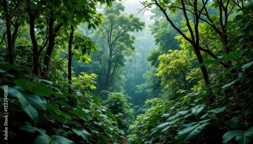 Naklejka premium Lush Green Forest Pathway Surrounded by Tall Trees and Gentle Morning Mist in...