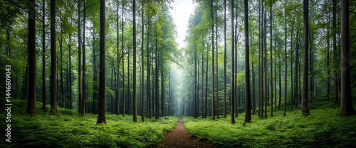 Obraz premium Lush green forest pathway, tall trees, misty atmosphere, tranquil scene,...