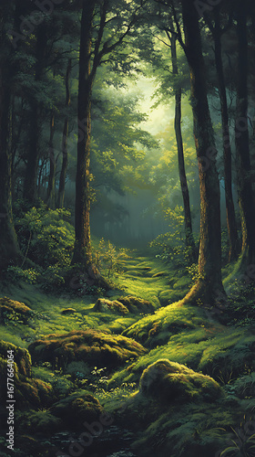Obraz premium Lush green forest pathway with vibrant light and flowing water surrounded by...