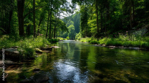 © utaem2022, Obraz premium Lush green forest reflecting in calm river on sunny day