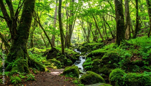 © Akih, Obraz premium Lush Green Forest Scene - A Serene Landscape with Flowing Stream and Dense Foliage.