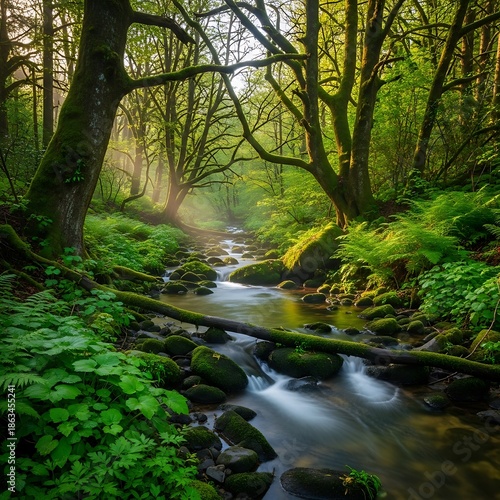 © Lutvyana, Obraz premium Lush green forest scene depicts a sunlit, moss-covered stream flowing over rocks