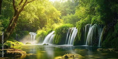 © Gular, Obraz premium Lush green forest scene featuring cascading waterfalls and serene river with sunlight filtering through trees creating a tranquil atmosphere.
