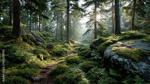 © Anna, Obraz premium Lush Green Forest Scene Sunlight Through Tree Canopy